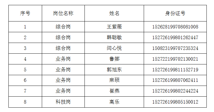 經(jīng)過(guò)簡(jiǎn)歷甄選、資格審核、面試和筆試等環(huán)節(jié),根據(jù)招錄規(guī)則及各崗位成績(jī)排名,以下8人擬定為杭錦旗農(nóng)信社本次校園招聘入圍名單。現(xiàn)予以公示,公示期5天。