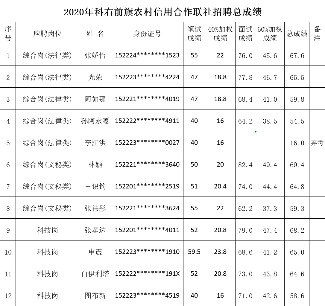 科爾沁右翼前旗農(nóng)村信用合作聯(lián)社關(guān)于公布2020年校園招聘總成績(jī)的公告