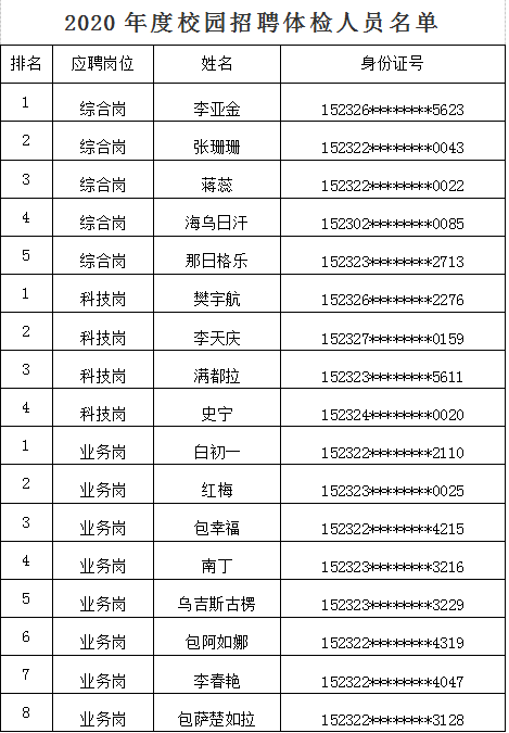 根據(jù)《內(nèi)蒙古自治區(qū)農(nóng)村信用社聯(lián)合社2020年轄內(nèi)法人機(jī)構(gòu)應(yīng)屆高校畢業(yè)生校園招聘工作的通知》要求,按照筆試與面試5:5的比例加權(quán)計算出總成績,排名由高到低確定進(jìn)入體檢環(huán)節(jié)人員,綜合崗5人、科技崗4人、業(yè)務(wù)崗8人。如有自動放棄或體檢不合格的情況,將按報考崗位成績由高到低的順序遞補(bǔ)。現(xiàn)將體檢工作有關(guān)事項通知如下: